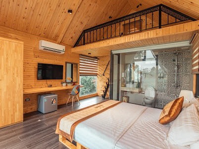 Tầng 1 có 1 giường lớn để khách có thể ngả lưng thoải mái khi xem tivi. Bungalow được trang bị đầy đủ đồ dùng chẳng khác gì phòng nghỉ ở các resort cao cấp như: tủ lạnh mini, ấm đun nước siêu tốc, bộ tách trà, bàn trang điểm, máy sấy, đèn xông tinh dầu,…