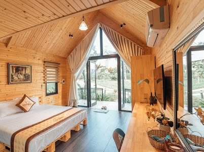 Kiến trúc của Ngọc Lan Bungalows theo phong cách phương Tây mà chúng ta thường thấy ở những cảnh quan ven rừng của xứ sở tuyết trắng. Những ngôi nhà nhỏ màu xanh ngọc bích làm nổi bật một khu vực ở Le Farm.
