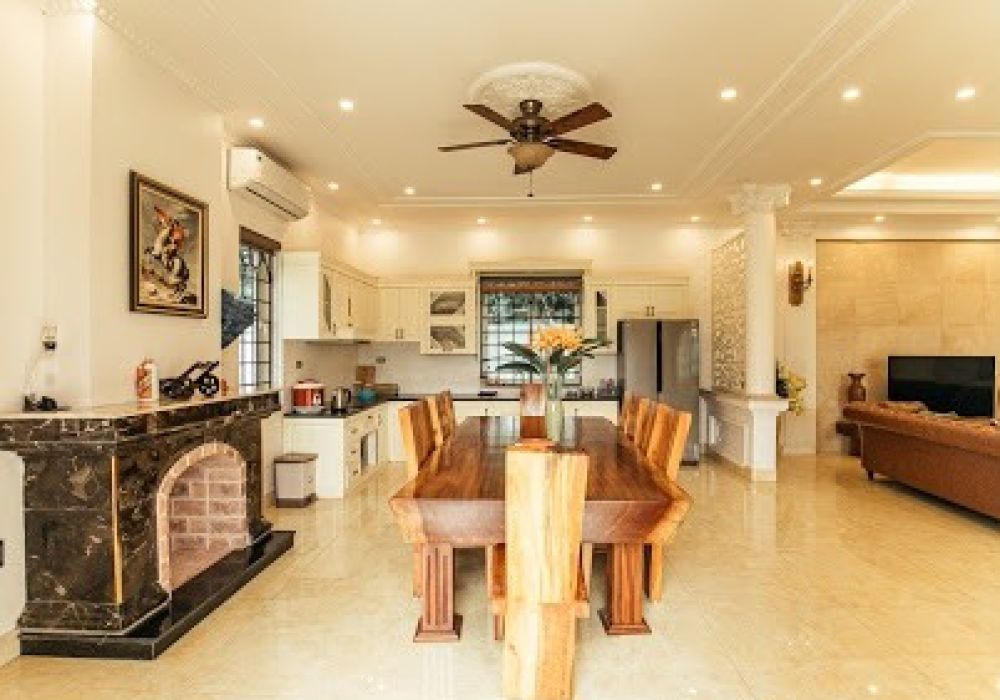 Phòng bếp rộng rãi với đầy đủ thiết bị và dụng cụ nấu nướng. Tủ lạnh side by side đủ công suất chứa đồ ăn cho đoàn trong suốt thời gian lưu trú.