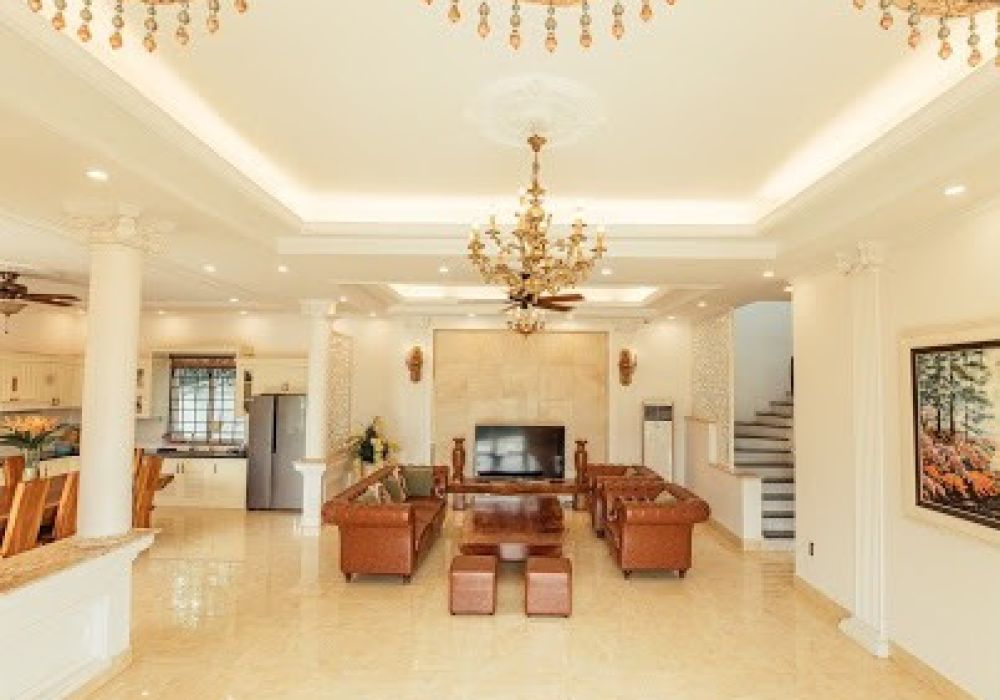 Tầng 1 gồm phòng khách rộng với bộ sofa bọc da êm ái. Cả nhóm có thể ngồi quây quần xem tivi, hát karaoke hay đánh bài vui vẻ. Trẻ em có thể chơi bắn cung, cờ vua và vui chơi trong không gian rộng lớn này.