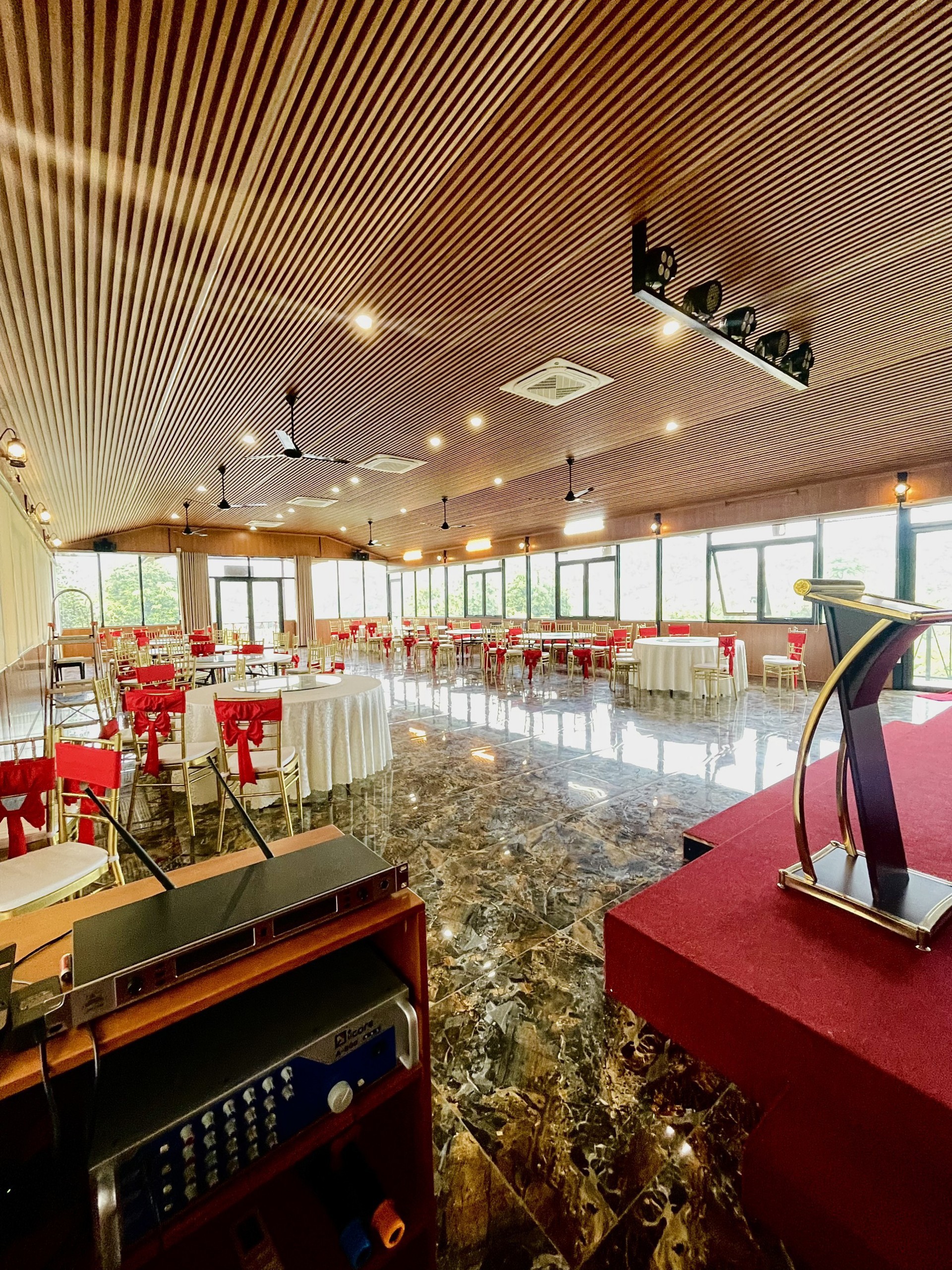Phòng Hội Trường Le Farm – Một trong những homestay hiếm hoi tại Ba Vì sở hữu phòng hội trường trong nhà sang trọng, đáp ứng hoàn hảo nhu cầu tổ chức hội họp, hội nghị, đào tạo, team building kết hợp tiệc gala. Với thiết kế hiện đại, không gian thoáng rộng, hệ thống âm thanh – ánh sáng chuyên nghiệp, hội trường có sức chứa lên đến khoảng 150 khách, phù hợp cho nhiều loại hình sự kiện từ quy mô vừa đến lớn. Đây là lựa chọn lý tưởng cho doanh nghiệp, tổ chức và đoàn khách muốn kết hợp công việc với nghỉ dưỡng trong khung cảnh thiên nhiên yên bình của Le Farm.