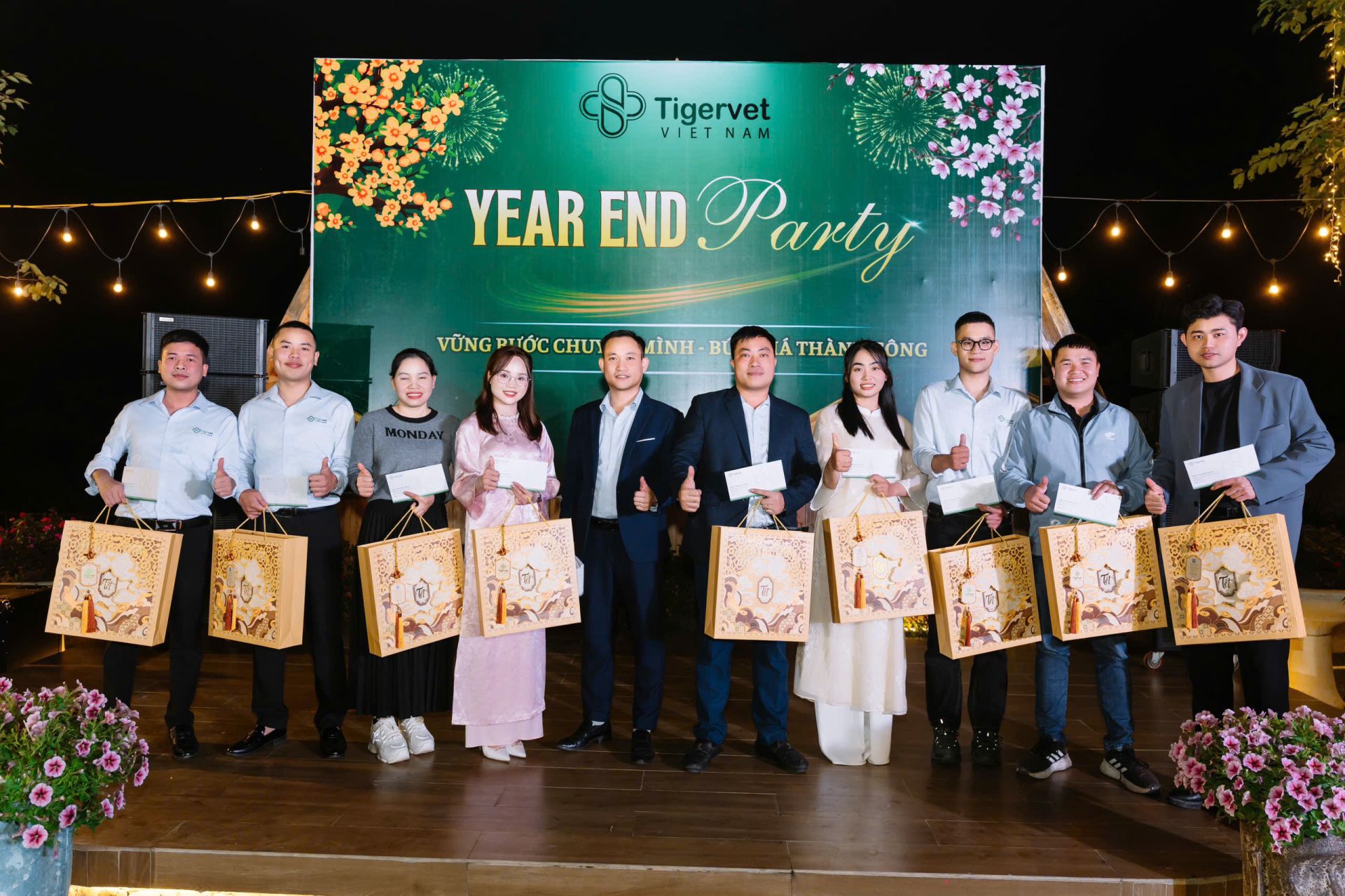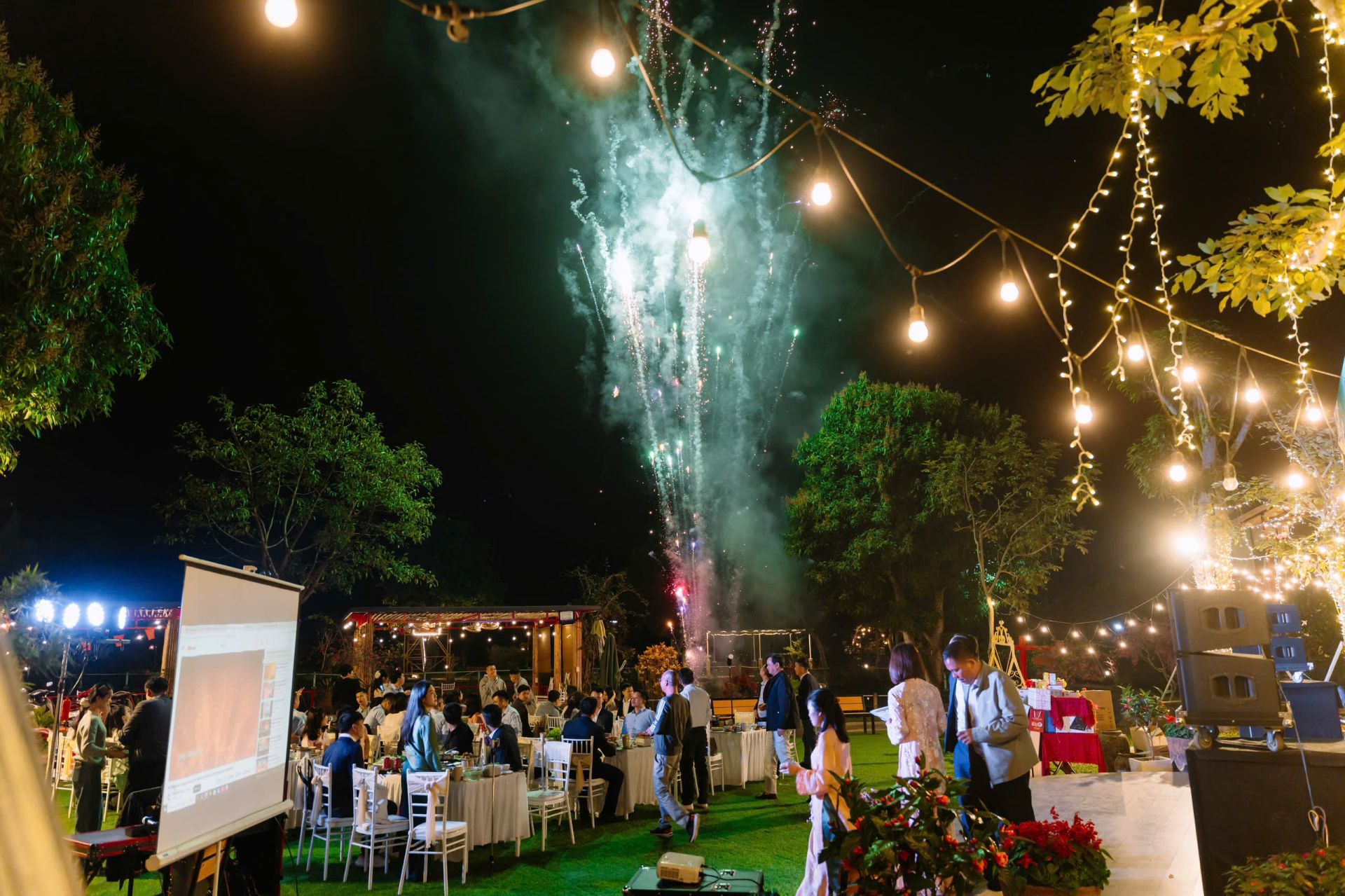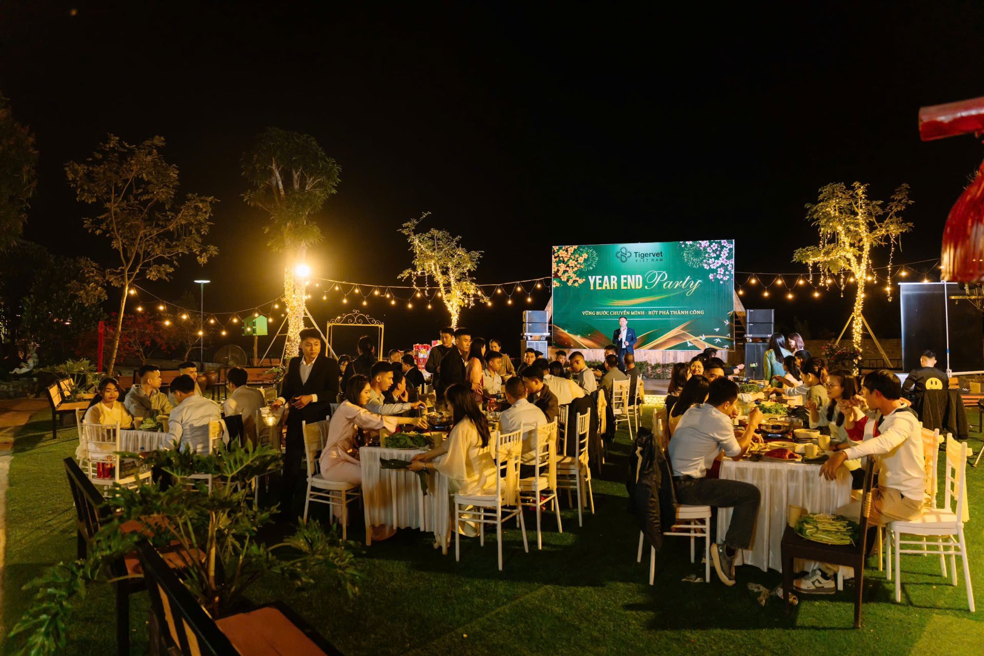 Tiệc Year End Party ngoài trời diễn ra trong không gian ấm cúng, rực rỡ ánh đèn giữa thiên nhiên thoáng đãng, mang đến bầu không khí vừa sang trọng vừa gần gũi. Sân khấu được trang trí tinh tế với backdrop nổi bật, ánh sáng lung linh tạo nên khung cảnh lý tưởng cho những khoảnh khắc gắn kết và bùng nổ cảm xúc. Đây không chỉ là buổi tiệc tổng kết cuối năm, mà còn là dịp để tập thể cùng nhìn lại hành trình đã qua, sẻ chia niềm vui, tiếp thêm năng lượng và tinh thần sẵn sàng cho một năm mới thành công hơn.